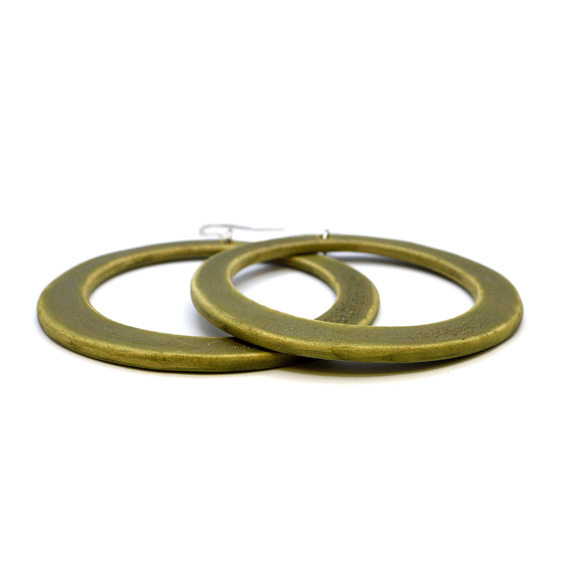 Porcelain dangle earrings - very large hoops of green-khaki colour. Double sided, with sterling silver hooks. Matte surface, rough and embossed in places.