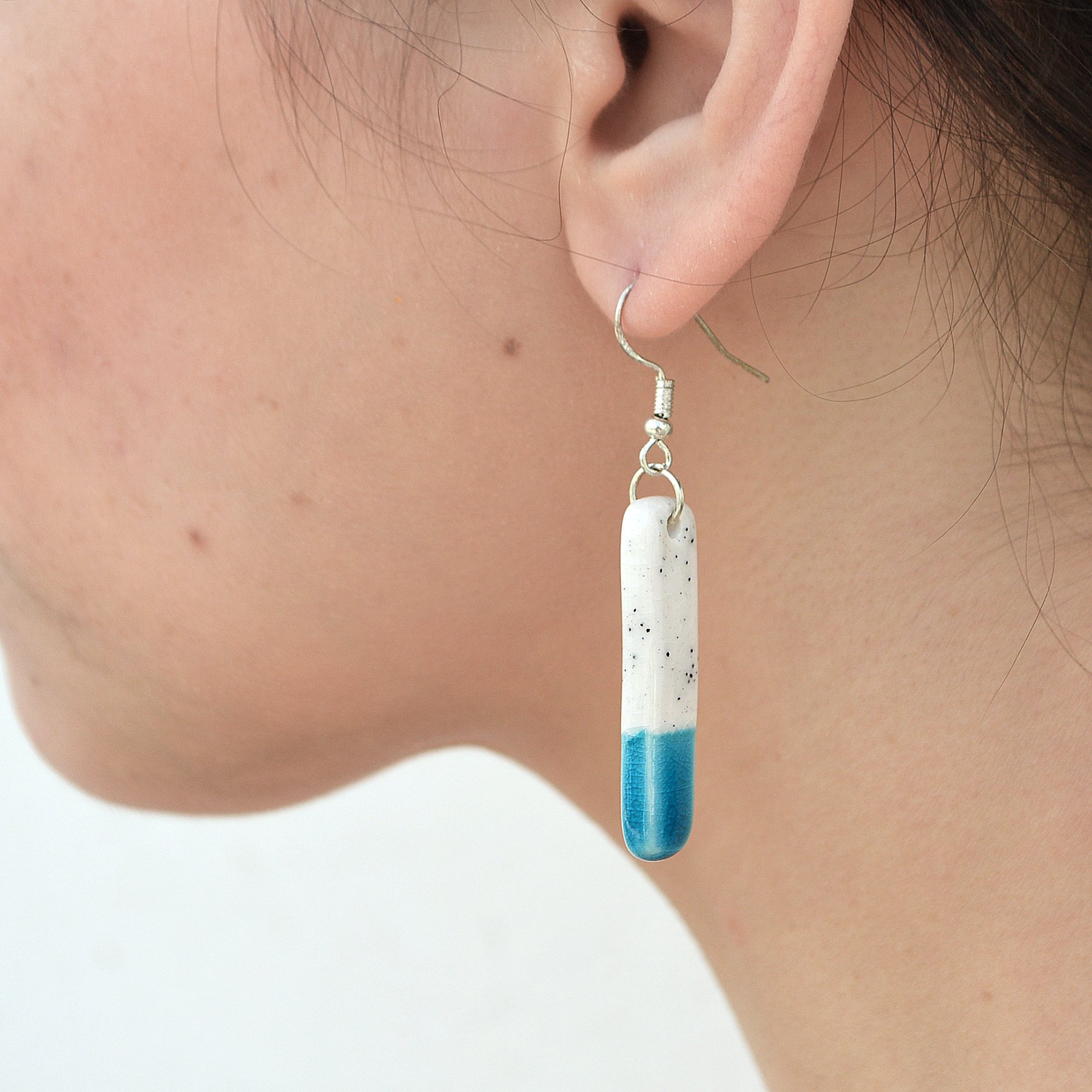 Porcelain dangle earrings-bars with silver sterling hooks. Double-sided. White speckled gloss glaze on the top part, sea-blue crackled gloss glaze at the bottom.