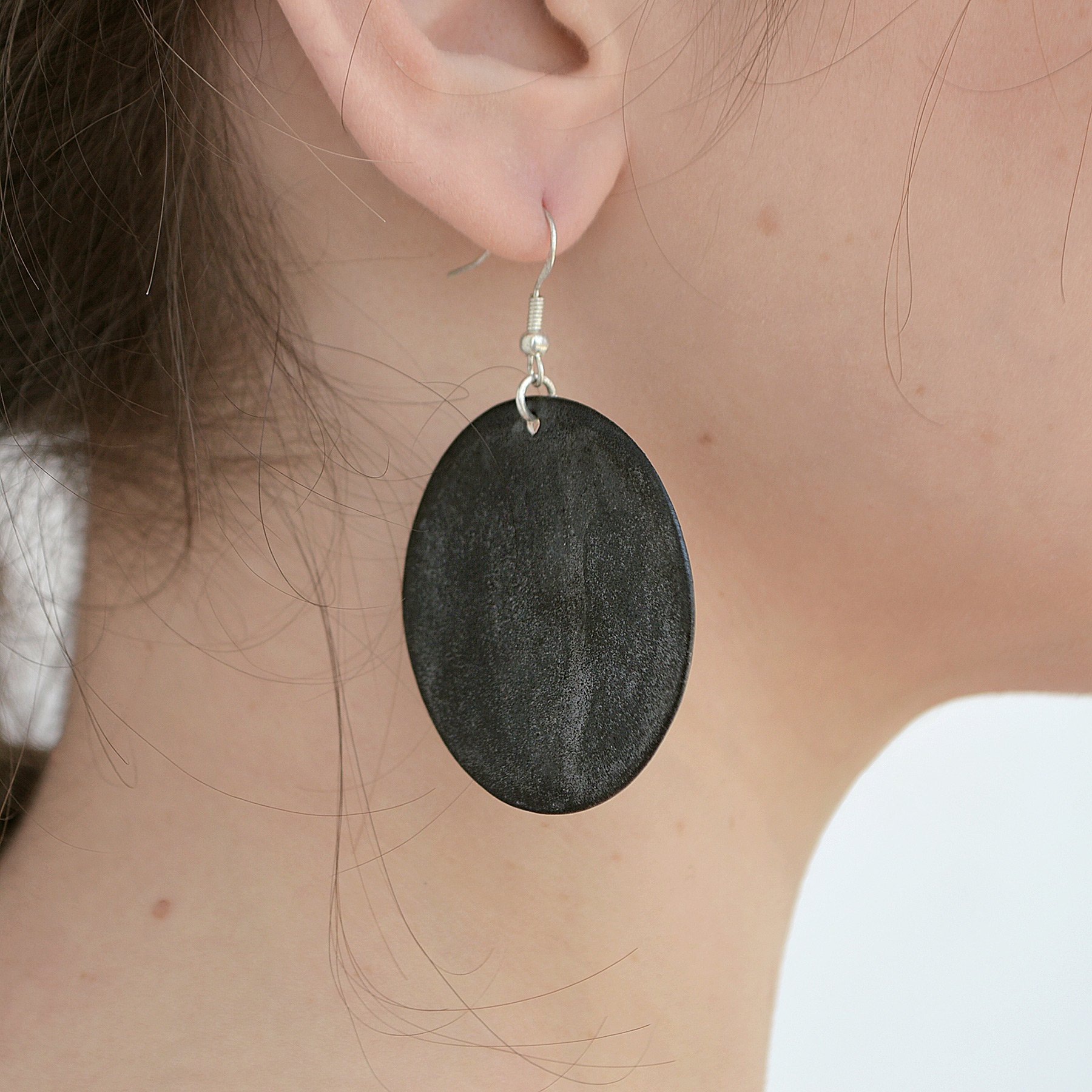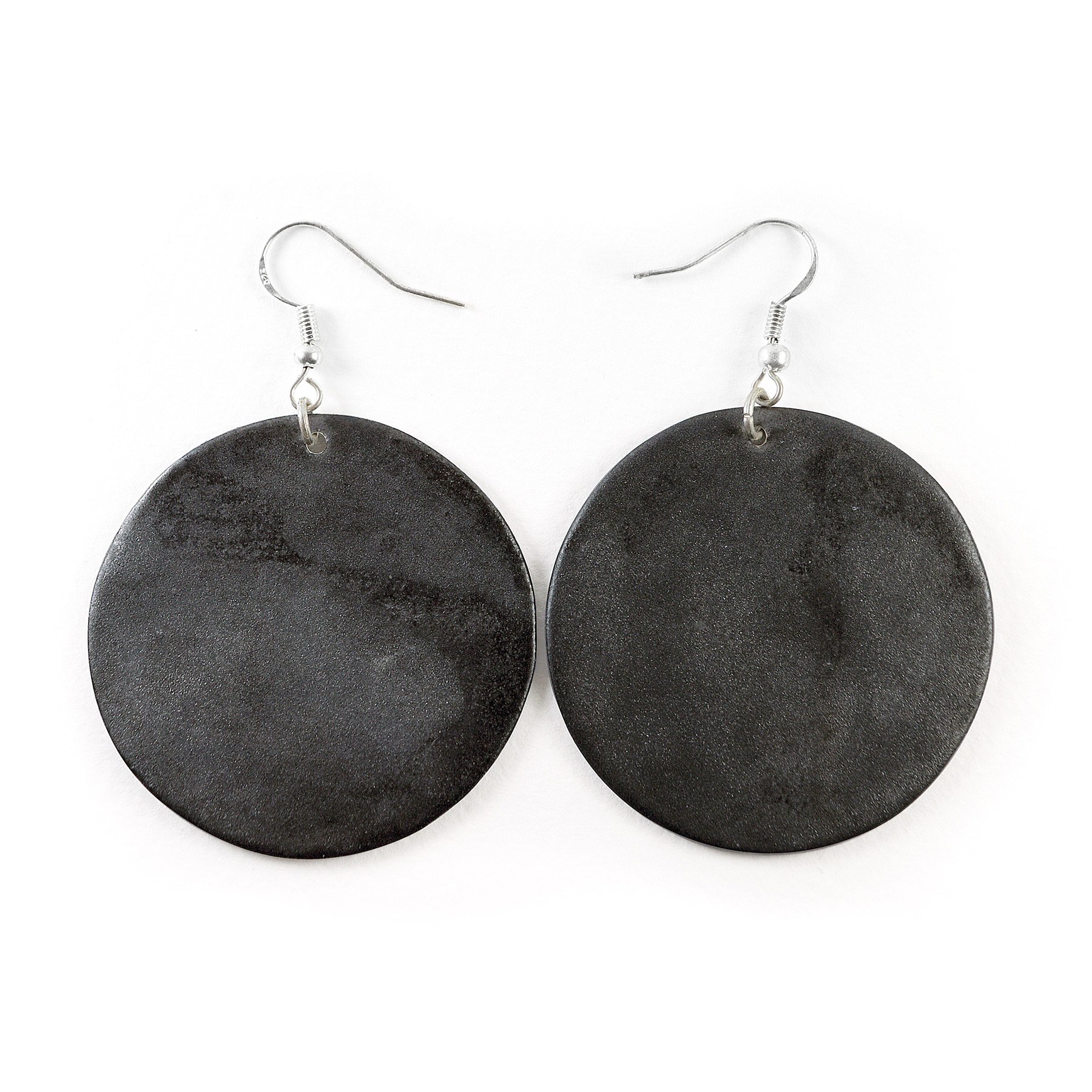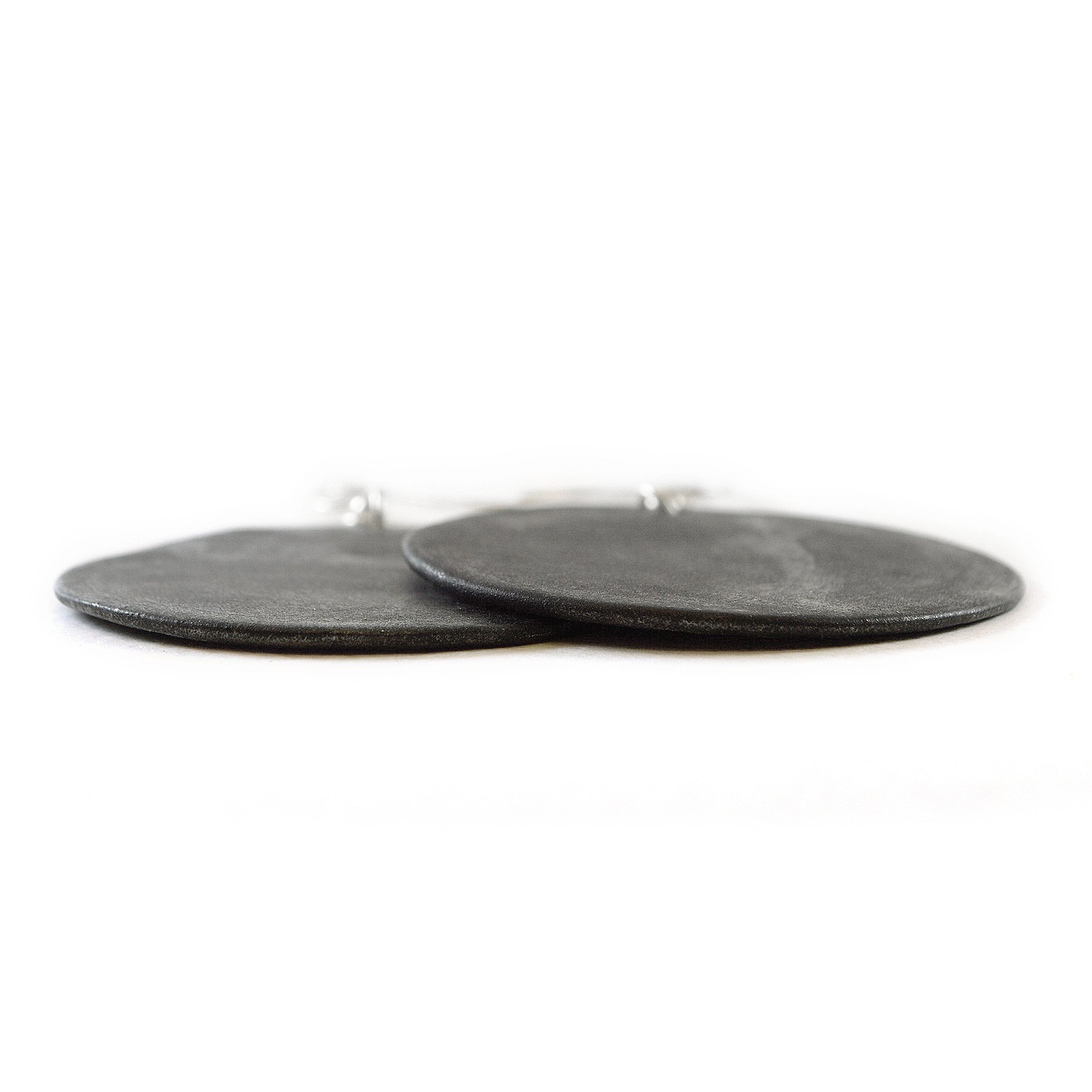 Porcelain dangle earrings-discs with silver sterling hooks. Double-sided, matte silver-black surface.