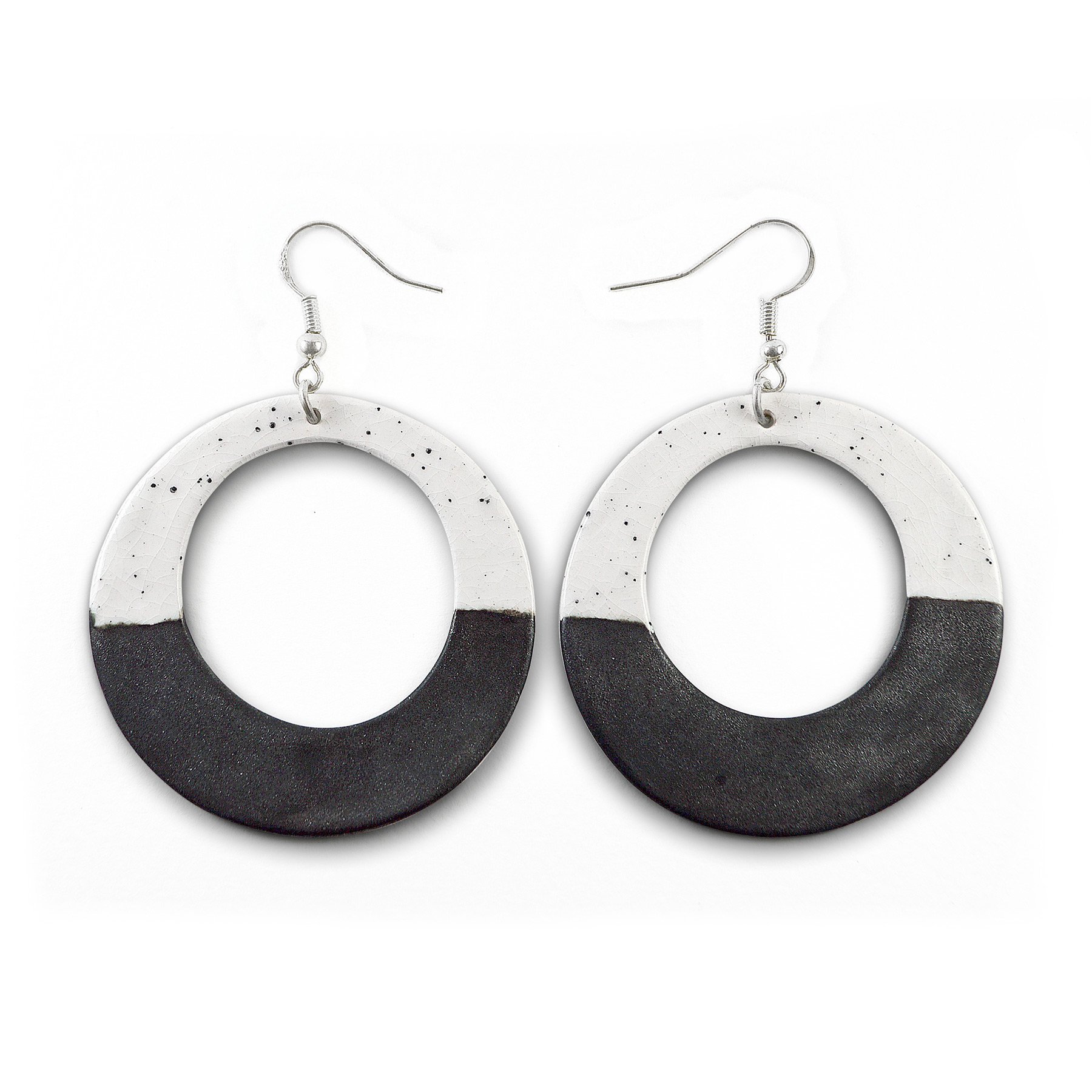 Porcelain dangle earrings-hoops with silver sterling hooks. Double-sided. White speckled glossy surface on the top half, shiny silver glossy glaze at the bottom half.