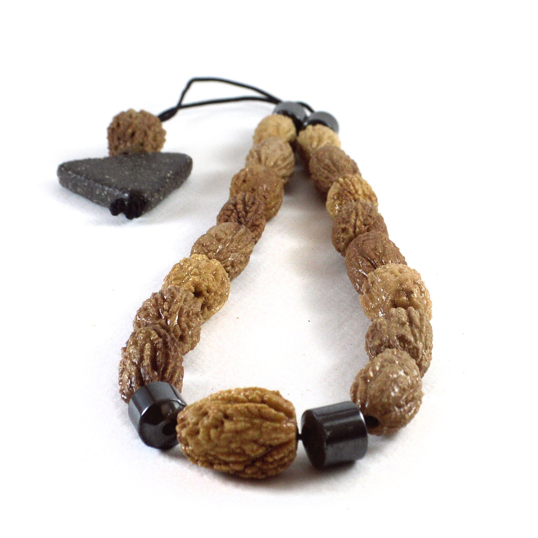Χειροποίητο κομπολόι με 17 χάντρες από λουστραρισμένο κουκούτσι ελιάς σε διάφορες αποχρώσεις του καφέ και 4 χάντρες αιματίτη κυλινδρικού σχήματος. Στη θέση της φούντας υπάρχει ένα τριγωνικό κεραμικό στοιχείο με 1 επιπρόσθετο μεγαλύτερο κουκούτσι ελιάς.